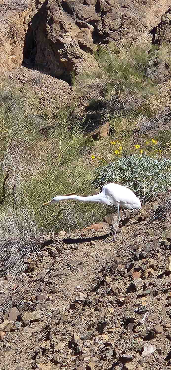 After checking the weather once more, it was clear to us that northern Arizona was just not going to happen this trip. The rains to the south were snow to the north, so Sedona, Flagstaff etc. were off the radar and we ended up going back the way we came some 5+ weeks ago. We had wanted to stay on Lake Havasu but the campground was full, and we lucked out at the last minute to get into River Island State Park just below the dam in an area known as Parker Strip. Lucked out is actually correct on a few levels, first it was open, and second, this turned out to be a great place! Lots of trails and viewpoints to keep us going for a few days (we were trying to squeeze as much warm sunny weather as possible before heading farther west). As it was pretty much at the limit of our road time getting here, we spent the rest of the afternoon just lazing around the campground. The next morning we hit the trail as the saying goes, and set off to tackle the Buckskin Loop Trail that starts at the neighboring Buckskin Mountain State Park. This was listed as and easy hike, but we would suggest it is more moderate than easy! We spent hours on this short 1.5 mile loop, the flowers were just starting to bloom and the geology was giving up it's bounty as well. The weather? PERFECT, mid 70's and sunny! Our backs a little sore afterwards from all the bending over and picking through rocks and the small little flowers giving their blossoms to the camera. The big surprise was getting almost all the way back to the truck when Jill spotted a White Egret just 20 yards away catching a lunch of lizard off a bush. Back to camp to relax in the sunshine! Next day we headed into Lake Havasu City to check out London Bridge and the island area, but quickly decided this was not really our cup of tea, and headed back to our camp to enjoy our second to last last day in the Arizona Desert. Next morning we got up and headed into Parker to visit the Chevy dealer, hard to believe we had traveled a little over 5k miles, time for an oil change! We spent the rest of the day checking out the Parker Strip area on the California side of the river. Very interesting BLM areas where a lot of geezers were spending the winter. We had been looking at a bench up at the top of the cliff overlooking the campground for a couple days, so this afternoon when we got back was the time to figure out how to get up there! Steep but worth the view. We headed back to camp and just enjoyed the evening before we would be leaving the next morning heading to Bakersfield.
