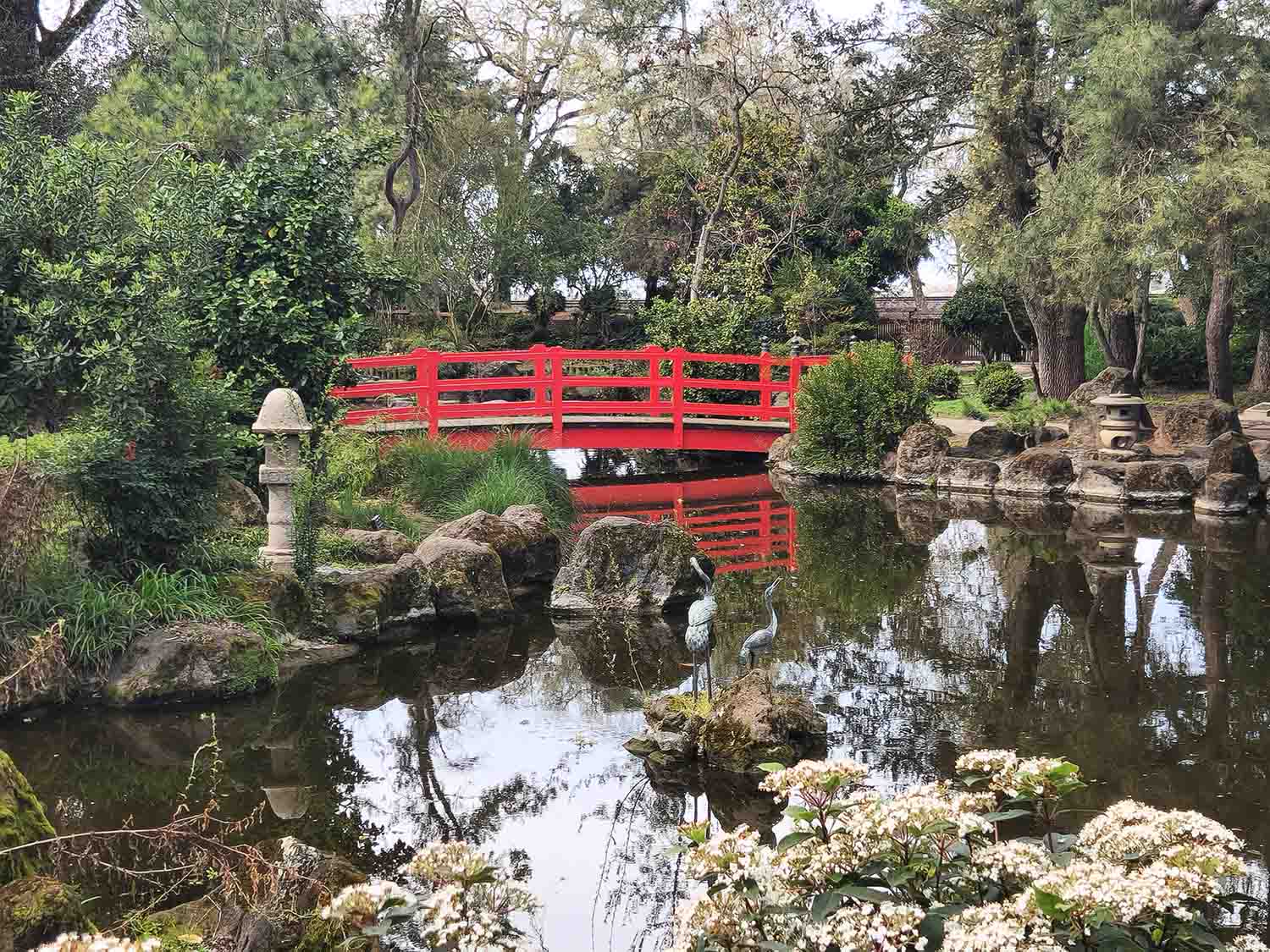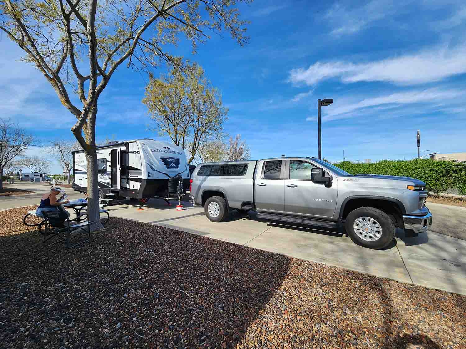 We bid farewell to Bakersfield and made our way west to I-5 and then hung another righty tighty and headed north. No fog in the valley for us today which we very much were grateful for, sun and warm, awesome! We made our way up past Stockton to Flag City and the Flag City RV park. This was a pretty dang nice park, far enough away from the freeway, clean, even had concrete pads next to the trailer. We set up (which by now takes about 5 minutes) and sat back in our chairs and took a very deep breath. This was our second to last stop of our trip, so we wouldn't call it full on depression, but something to that effect. After enjoying the afternoon we treated ourselves and went into Stockton to watch a play at the Black Box Theater! Yes Jill and all the Hansen clan has transformed me into a semi cultural fanatic of the theater, especially after many years going to Ashland for the Shakespeare Festival. Turns out this is a very small theater, even smaller than the Bend theater, so a very close intimate experience for sure! What was the play you ask? Well it was Grand Horizons of course! Imagine a couple of old farts going to see a play about another couple of old farts getting a divorce.... It was very entertaining and we very much enjoyed the evening. Next day we headed to the Japanese Garden in Micke Grove Park, just east of us. It was smaller than we were envisioning, but very nice none the less. After we hit up the Taste Of India Cafe right next to the RV park and had a very good and delightful lunch. Back to the park (burp) for an afternoon sit in the hot tub before watching a movie that evening. Speaking of movies, this park had a large selection of DVD's and let us trade all our used ones that we had watched during this trip for new ones from their collection! Yee Haw, new movies for our next trip as we only had one more day before our final leg getting back home...