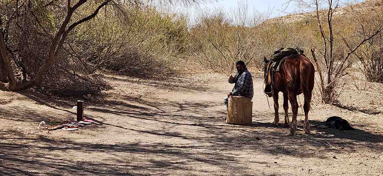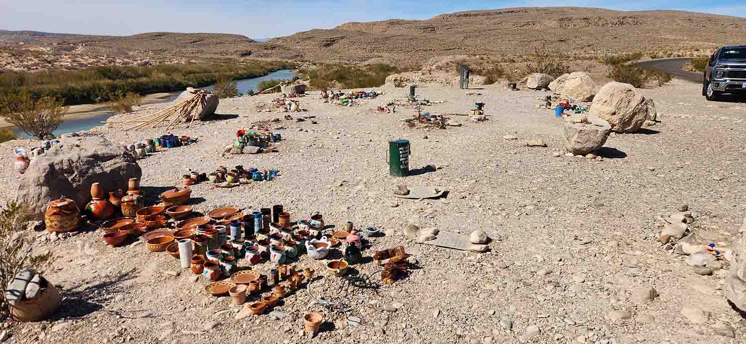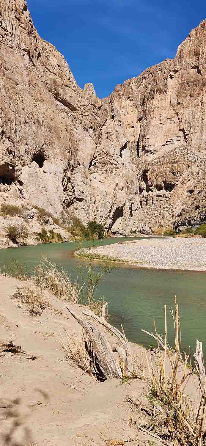 Today's adventure was to stay close to the Rio Grande Campground and see what was close to us. So first we went straight to the Boquillas Canyon Trail, and walked into the canyon as far as we felt comfortable. The issue was, the wind blowing into our faces through the canyon were very intense, like 70mph guessing. They were bad enough that I had to take my hat off, remove my hearing aids, shield eye's from dust etc. Sun was out, warm and beautiful but blowing everything sideways. From what we now know, this is semi normal, so no big deal. The canyon itself was fun and scenic, but we were to learn the best was yet to come.... We also found Mexican "Street Vendors" as we called them setting up self pay type systems and displaying their handmade goods along trails and auto pull offs along side the roadways. After inquiring I guess this has been going on for years, and a way for the isolated people of Boquillas to create a little to add to their meager existence. In addition they would ride their horses across the river and set up a spot alongside the trail (away from park rangers) and sell Tamales and Empanadas to us park visitors. Now one would think... "AWESOME", the real Mexican offerings,,, but when you realize that these foods were in their pockets or saddles, in the sun, for hours without refrigeration, the answer for us anyway was.... "No Thanks Senior"... The other thing on our "to do" list was for Jill to spot a Javelina, and for Tom, get a money shot of a Roadrunner (read prior pages, this was turning into an obsession, and we saw them a lot, but NEVER could get a good picture). So after the wind expedition, we did a few little things around camp, took in the birding views, and pretty much just relaxed in the sunshine and mid 70's weather. We had heard that it was a sold ice cube back home in Bend, something like 10 consecutive days of freezing fog and a white wonderland! OH DARN, SO SORRY TO HEAR THAT. CHUCKLE CHUCKLE.....