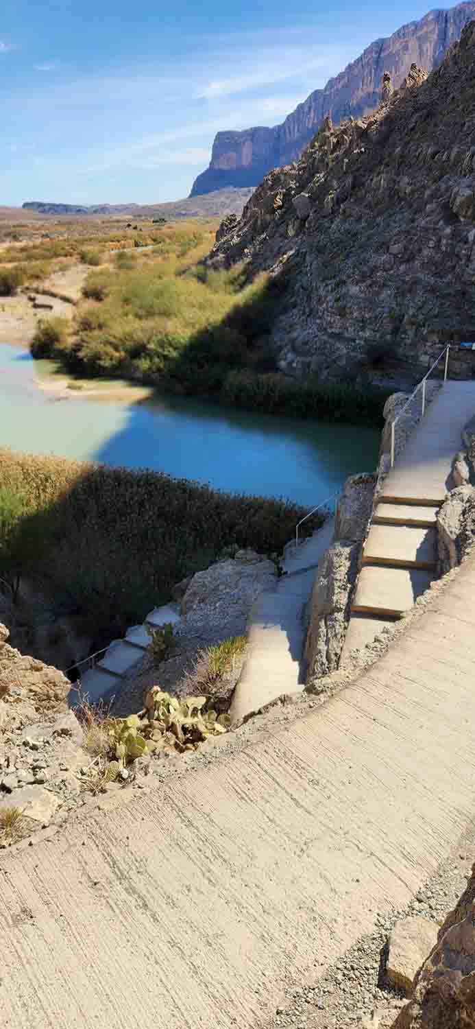 Next day we decided to drive to the other side of the park (west) and check out the Santa Elena Canyon area. Oh darn, another mid 70's to 80's day, with nothing but sunshine and high clouds. First stop was the visitors center at Panther Junction so we could check emails and internet to get caught up, then on to the Sotol Vista Overlook. WOW, now this is a view!!! Starting to get the grand feelings of Big Bend now! Big Bend is the only national park to hold an entire mountain range within it's borders. This view point is on the south west side of the Chisos Basin Rim area off the Ross Maxwell Scenic Drive. We wished we would have gone back during sunset as it would have been even more fantastic! Anyway, we did a few side trails and finally made it to the Santa Elena Canyon trail parking. The trail into the canyon was easy to access as the river levels were low but rather quickly turns into a series of stairs going up over a rock cropping. Then it drops down again to follow the river up to the point where the canyon walls pretty much stop forward progress without getting wet. We have heard that it is nice and peaceful in the canyon, and while visually stunning, there were the "echo" enthusiasts that kind of put a damper on the "peacefulness". But, a truly inspiring place and one we are glad to have visited!