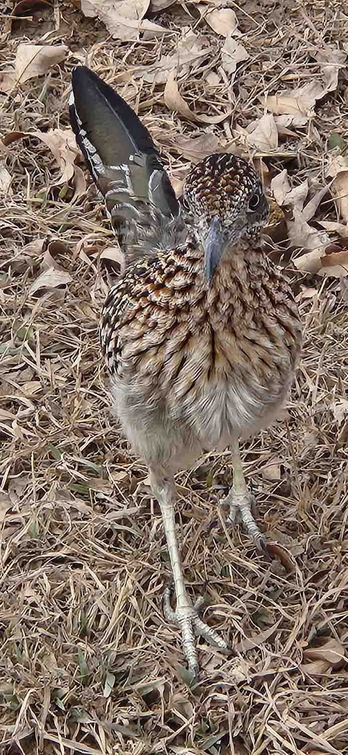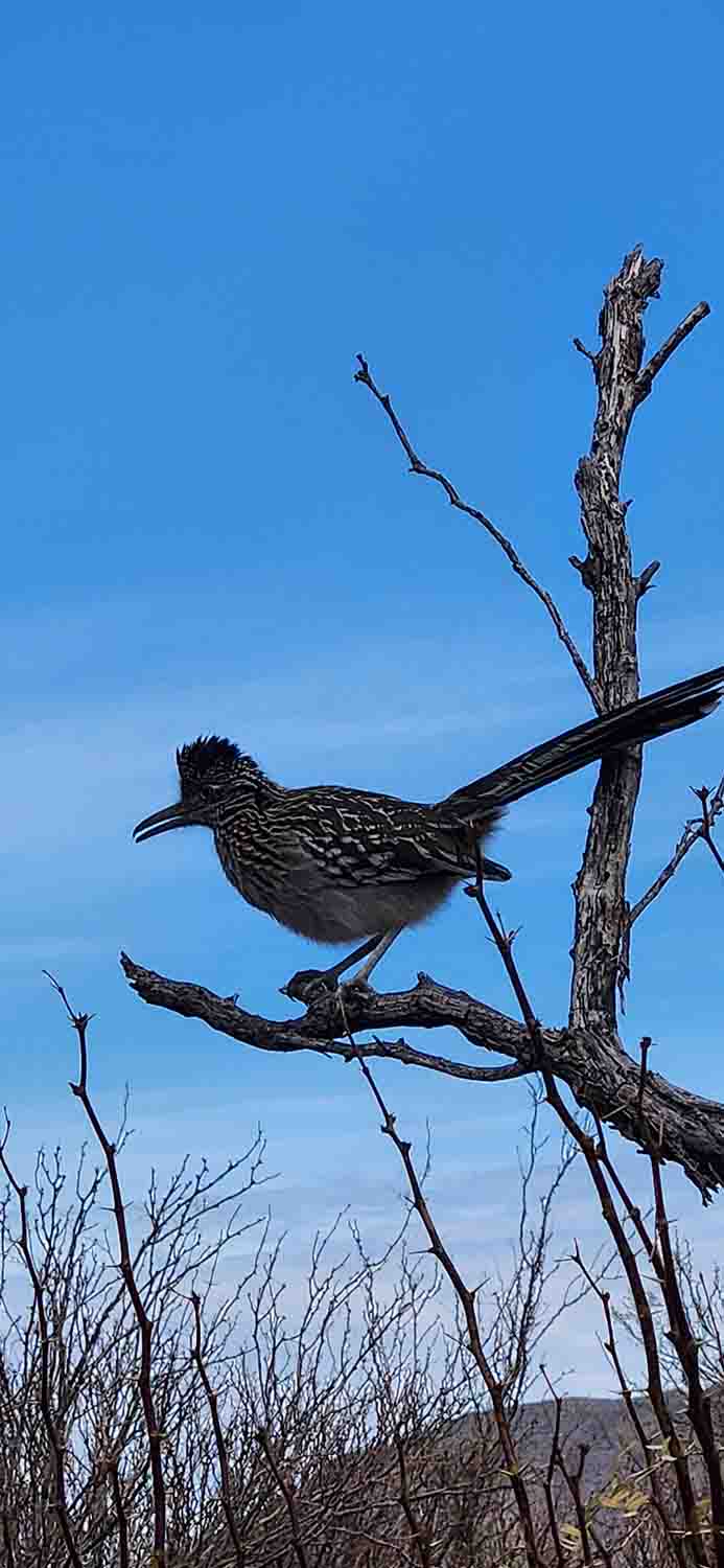 And then the guy ran off and gave himself up for some better pictures, but about that time across the road was his/her buddy saying "Pick Me, Pick Me". Well of course I was feeling like the Coyote in a cartoon, but hey I will suck once, and with phone in hand I did the "sneak" thing so well practiced for years archery hunting. I got within 3 feet of this guy and he even posed for me, so I am watching for the anvel dropping from the sky, right? So anyway, with the money shot completed I can now concentrate on other things, like a burro for instance.... And then guess what???? Next morning on our morning walk, another dang "Runner" flies up into a tree like 10 feet from us.... Well yaa, now the flipping "A$$wipe's" are just showing off after weeks of tantalizing me!!! Anyway, all joking aside, Roadrunners are spectacular, especially while flying away from you!!!